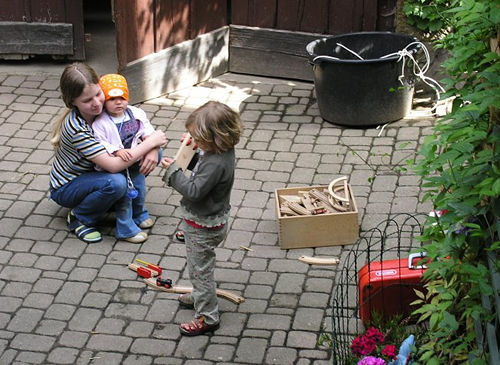 Nora und Monika spielen mit der Eisenbahn